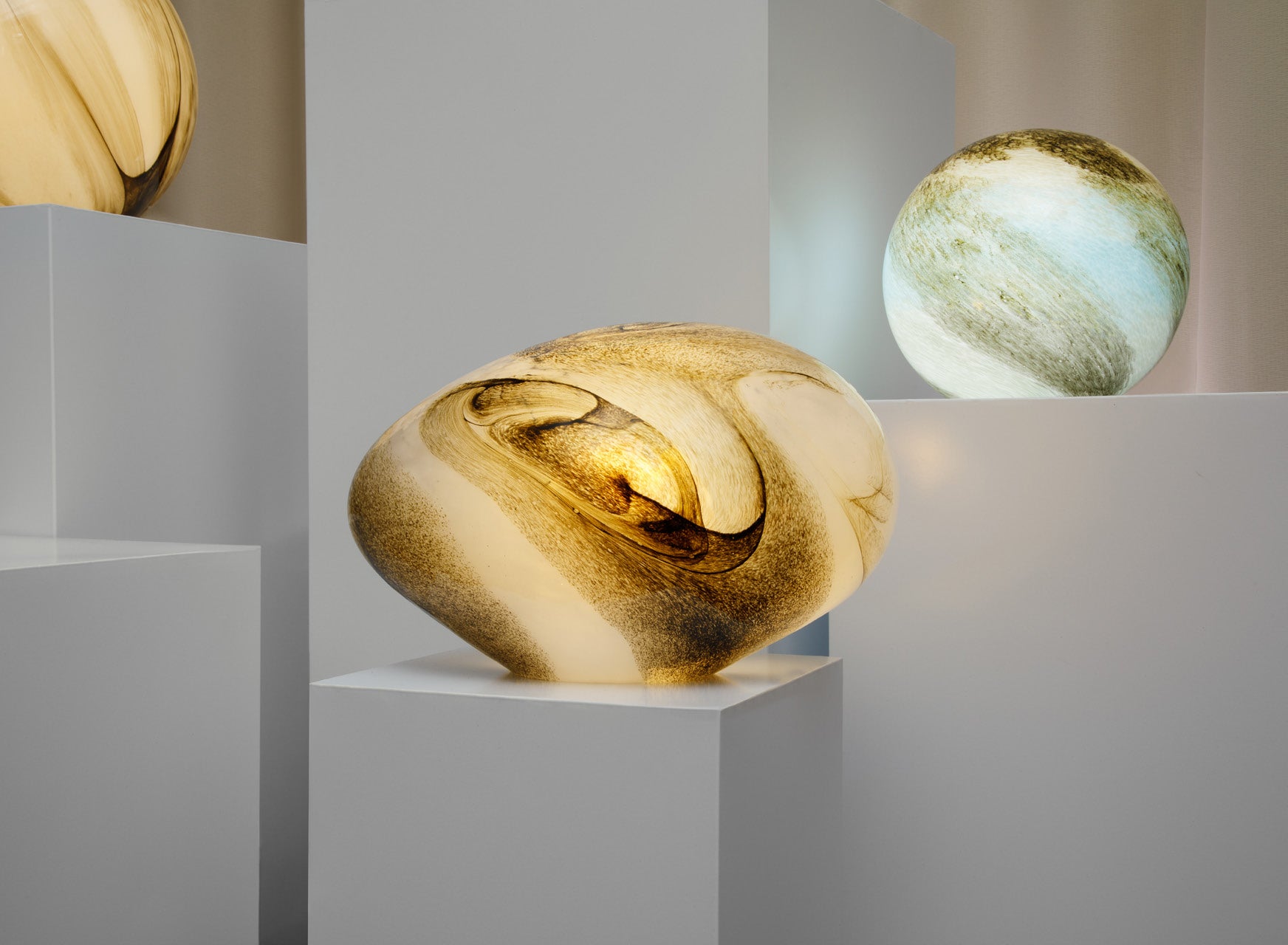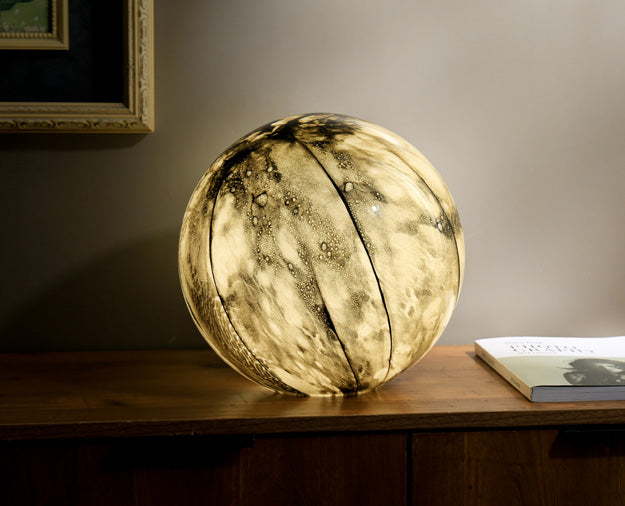 A sculptural table lamp crafted from hand-blown glass. The glass sphere creates ambient light that shifts through colours at the touch of a button, controlled via the included remote. Choose from warm whites for reading, soft ambers for winding down, or vibrant hues to set the mood.