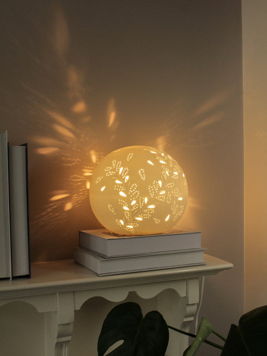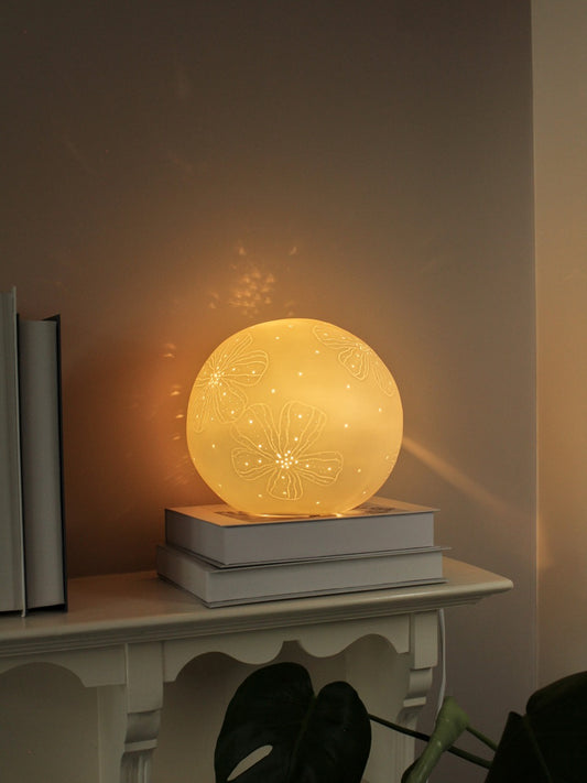 White Glazed Floral Pattern Table Lamp – Elegant Sphere Shape for Home Decor