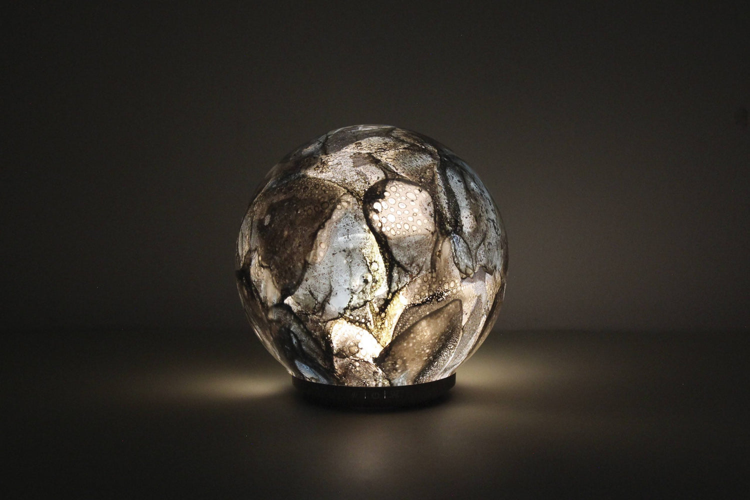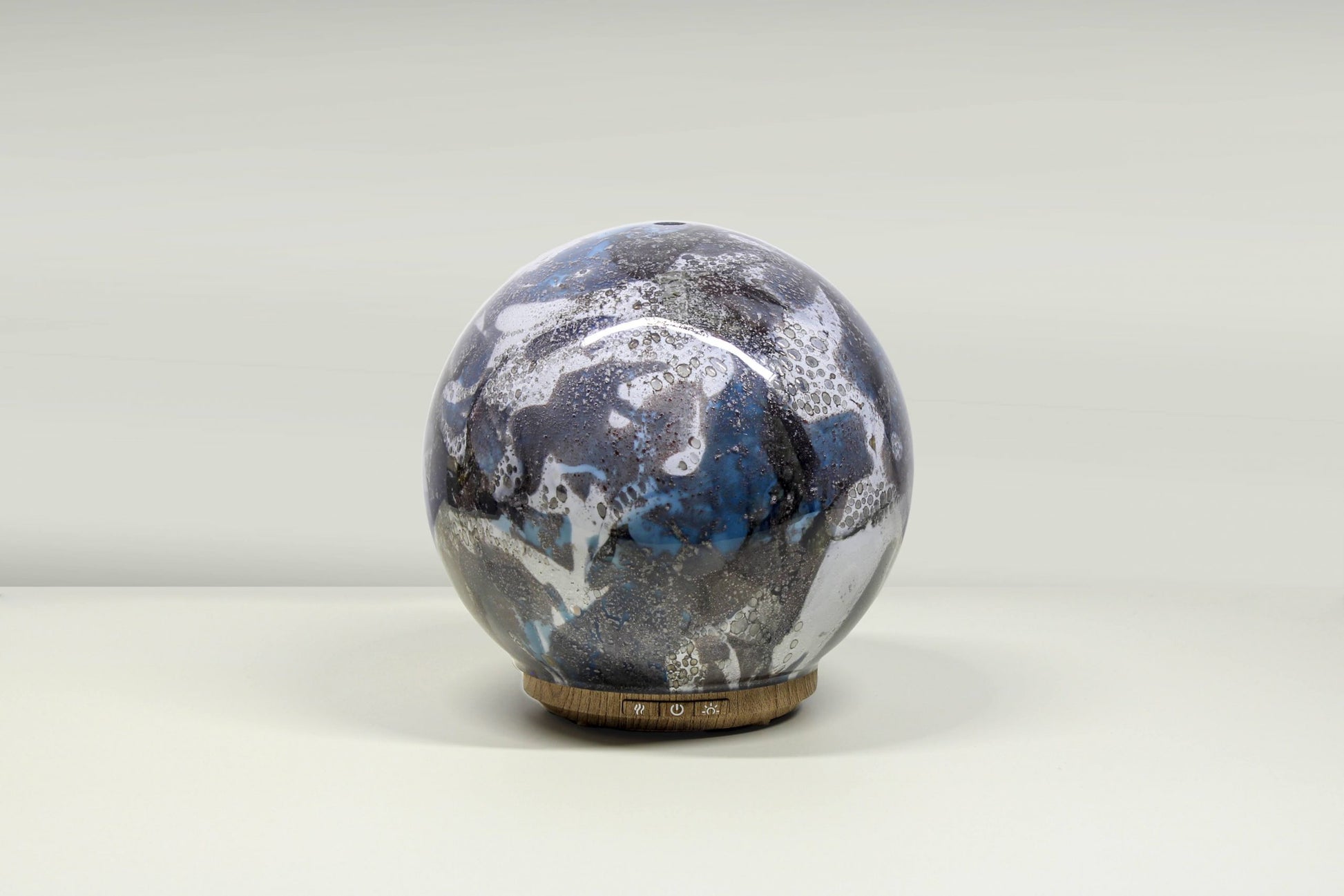 The three buttons on our glass lamp diffuser offer easy control: On/Off for powering the lamp, Stop/Start Diffusing to pause or resume essential oil diffusion, and Sunrise/Sunset to adjust the light intensity, mimicking natural light changes for a calming atmosphere.